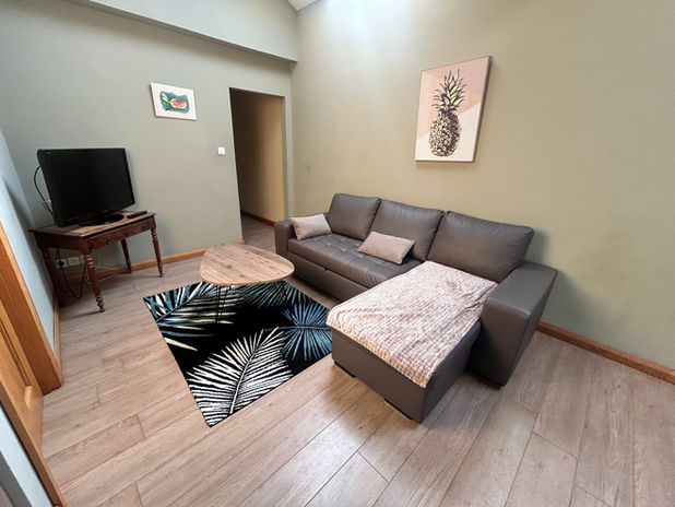 The apartment can comfortably accommodate up to 6 guests with one queen-size bed in the master bedroom and two double beds in the second bedroom. An additional pull-out couch in the living area brings the total capacity to 8 guests.